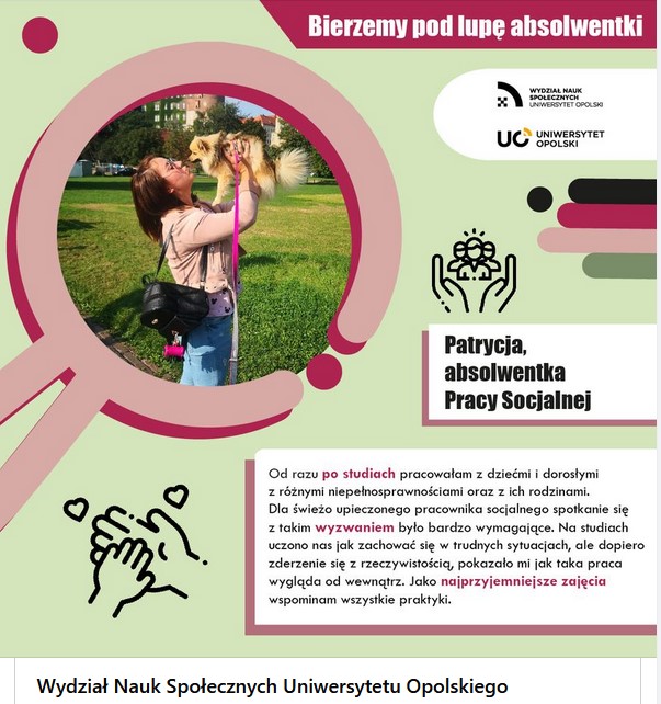 Dlatego przedstawiamy kolejną, dzisiejszą absolwentkę – Patrycję, która ukończyła studia na kierunku Praca socjalna i obecnie jest aktywnym zawodowo pracownikiem socjalnym, zajmującym się każdym działem pomocy społecznej.