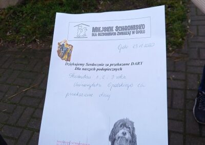 W dniu 23 grudnia 2020 roku przedstawiciele I roku na kierunku Praca Socjalna prowadzonego na Wydziale Nauk Społecznych Uniwersytetu Opolskiego, będący członkami Koła Naukowego Pracowników Socjalnych, przekazali Miejskiemu Schronisku dla Zwierząt w Opolu, środki pozyskane w przedświątecznej zbiórce wśród studentów pozostałych roczników. W trakcie prowadzonej zbiórki udało się zebrać karmę suchą i mokrą, przysmaki, zabawki, posłania, ubranka dla piesków i kotów. Łączna kwota zebranych darów rzeczowych dla schroniska wyniosła 520 zł.