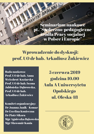 Serdecznie zapraszamy do udziału w Seminarium naukowym pt. Społeczno-pedagogiczne źródła pracy socjalnej w Polsce i Europie. Wprowadzenie do dyskusji wygłosi dr hab. Arkadiusz Żukiewicz, prof. UO.