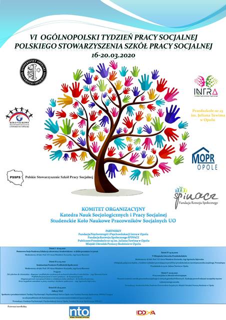 Instytut Nauk Pedagogicznych Uniwersytetu Opolskiego, Katedra Nauk Socjologicznych i Pracy Socjalnej, Studenckie Koło Naukowe Pracowników Socjalnych UO oraz Partnerzy organizacyjni mają zaszczyt zaprosić na VI już ogólnopolski Tydzień Pracy Socjalnej.