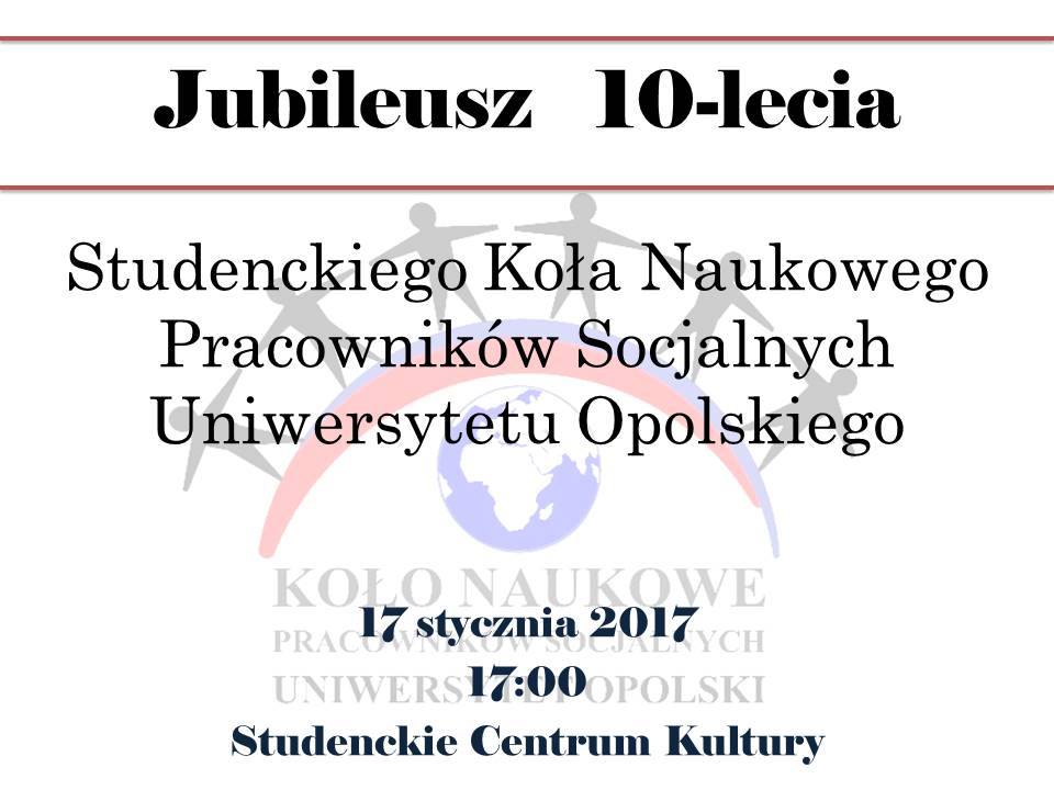 Członkowie Studenckiego Koła Naukowego Pracowników Socjalnych mają zaszczyt zaprosić Państwa na uroczystość obchodów 10-lecia swojej działalności. Odbędzie się ona 17 stycznia 2017 r. w Studenckim Centrum Kultury o godz. 17. Serdecznie zapraszamy!